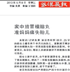 杨女士家住武昌,由于家里潮湿多虫,她放置了很多樟脑丸,喷洒了一些除虫除霉的消毒剂。昨日她突然感到腹痛,到医院一查是樟脑丸中毒,B超检查发现胎儿畸形,孩子不能要了。